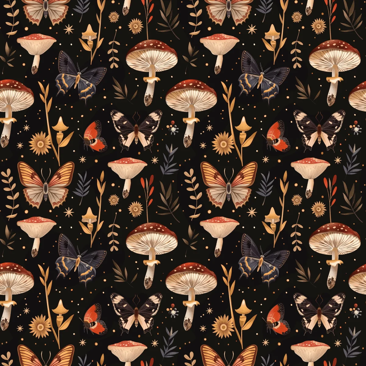 Moths & Mushrooms, seamless pattern, 3600 x 3600 pixels